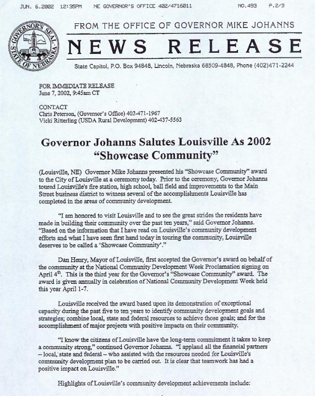 Dan Henry thanked Governor Johanns on behalf of Community of Louisville.
