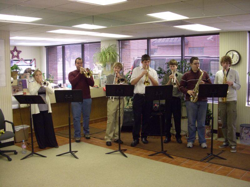 Geneva Johnson, Kevin White, Trevor Belter, Rob Meyer, Austin White, Tyler White and Noel Minchow played Christmas music at 12pm at the City Hall.