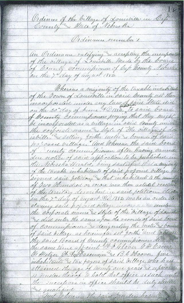 and Ordinance #1 of the Village of Louisville (dated August 1882) were served